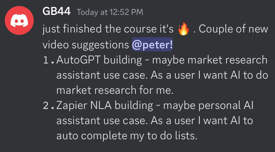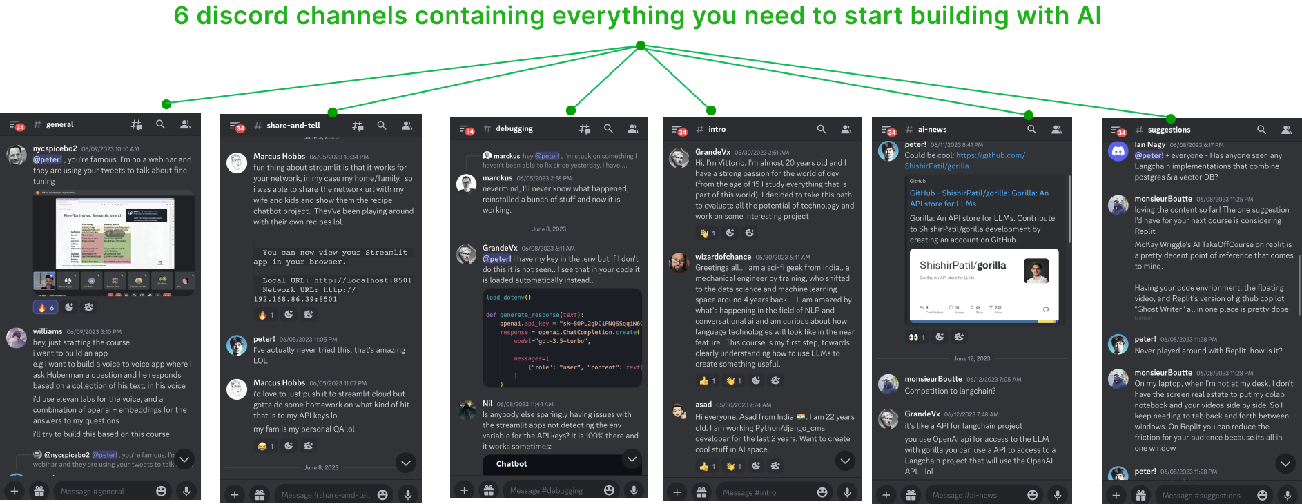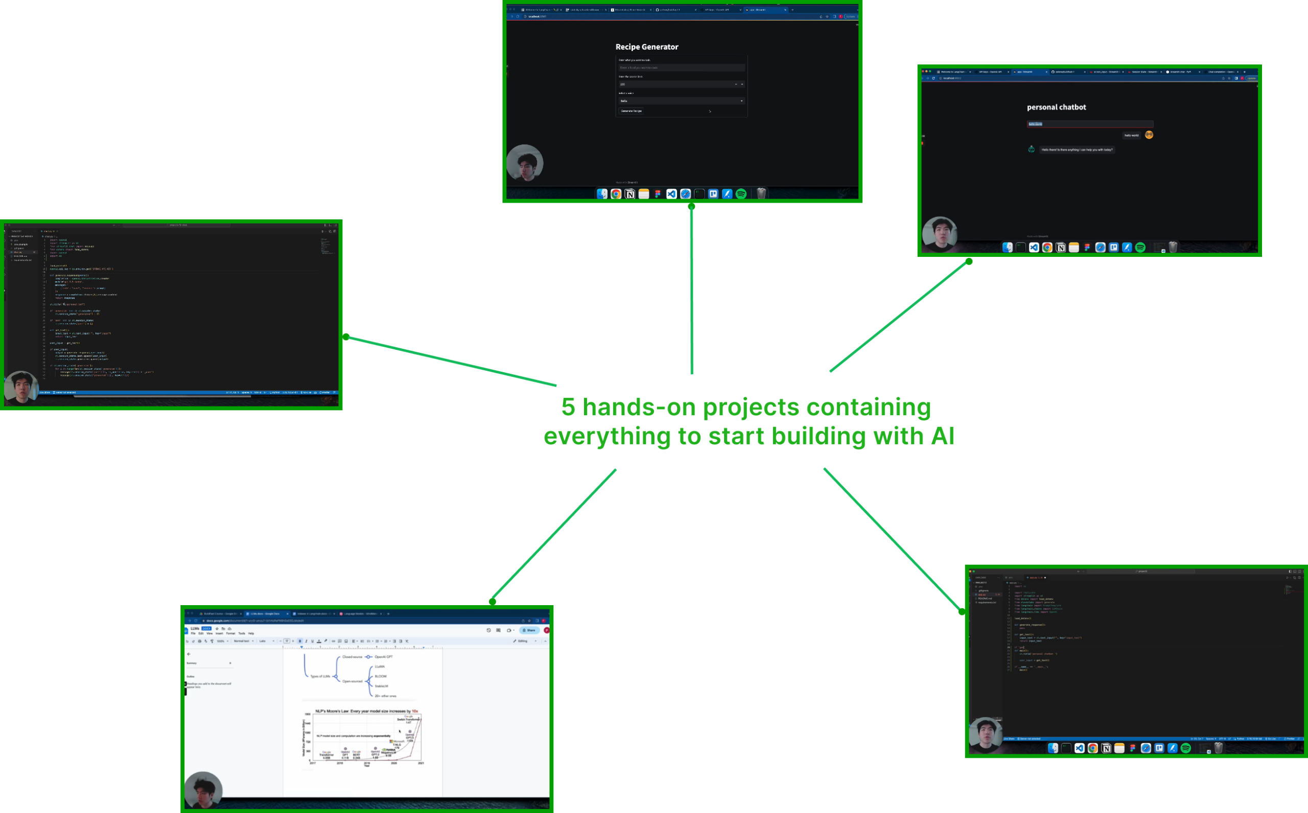 But unlike other AI courses, you won't learn passively – you will code 5 live-production projects (no AI experience required) and join a community of serial builders (from FAANG engineers to traders on Wall Street.)(No "business" or "project" idea required -- we give you the idea & teach you how to build it, fast!)